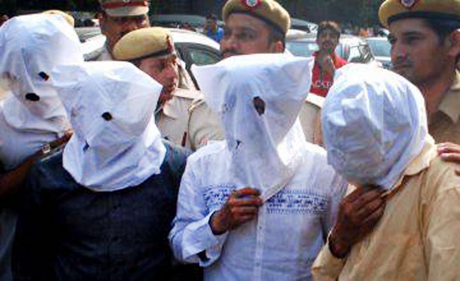 Suspected members of an organ trafficking gang wearing masks after their arrest in New Delhi.