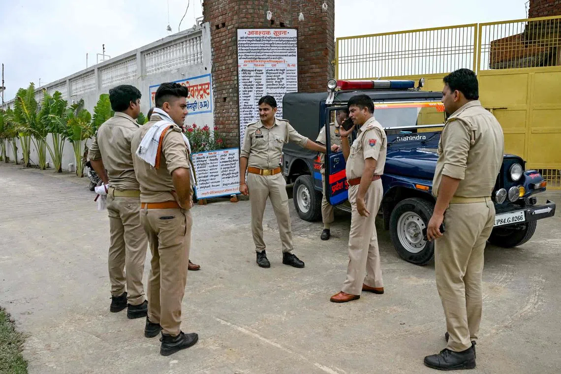 Police officers stand guard outside the ashram of Hindu preacher Bhole Baba in India’s Uttar Pradesh state.