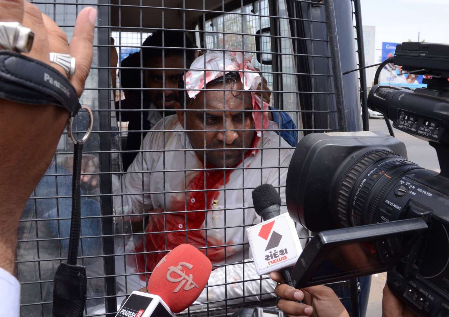 Indian Patel Patidar Community leader Laljibhai Patel sits in a police van after he was injured in clashes between supporters of Patel Patidar and Gujarat Police, on April 17, 2016.
