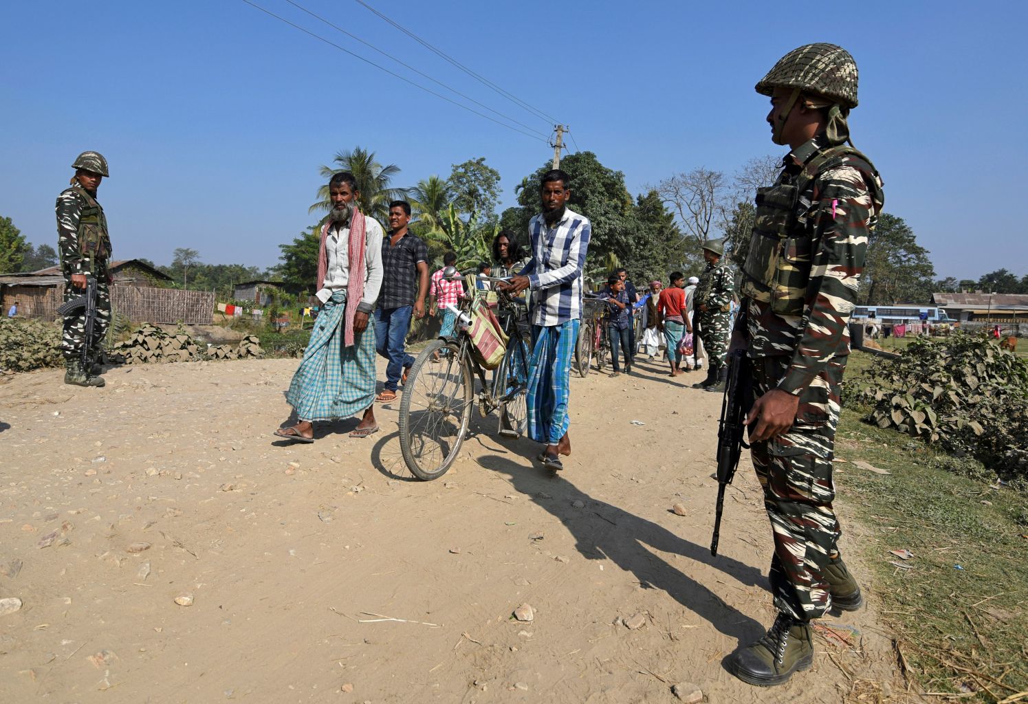 Villagers walk past Central Reserve Police Force (CRPF) personnel patrolling a road ahead of the publication of the first draft of the National Register of Citizens (NRC) in Assam, India on Dec 28, 2017.