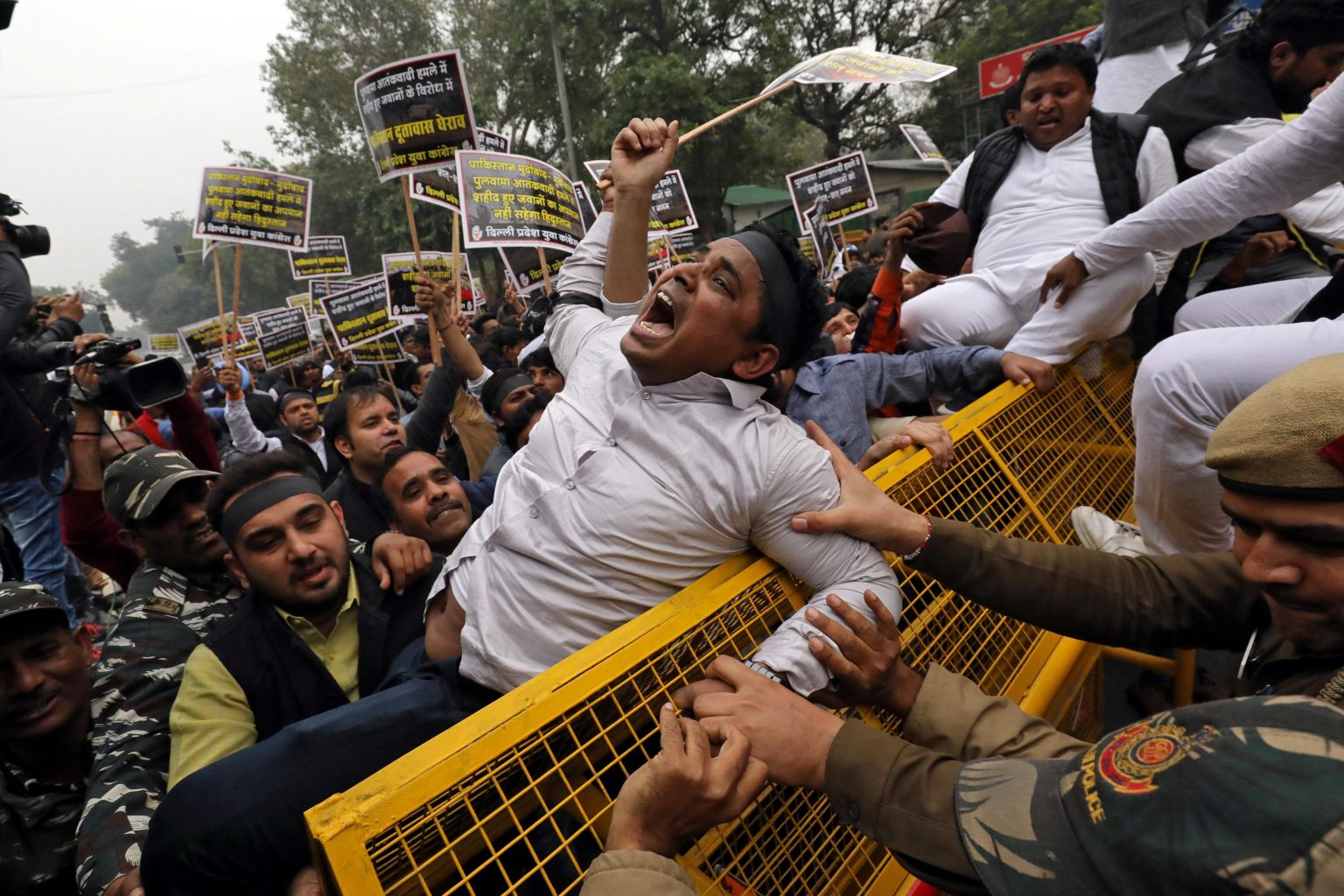 An activist of the youth wing of India's main opposition Congress party shouts slogans during a protest against the Feb 14 attack on a bus that killed 44 Central Reserve Police Force personnel, in New Delhi on Feb 15, 2019.