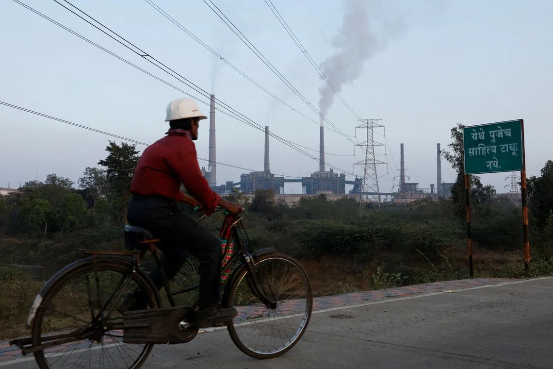 A factory worker riding a bicycle past the Super Thermal Power Plant in Chandrapur, India.
