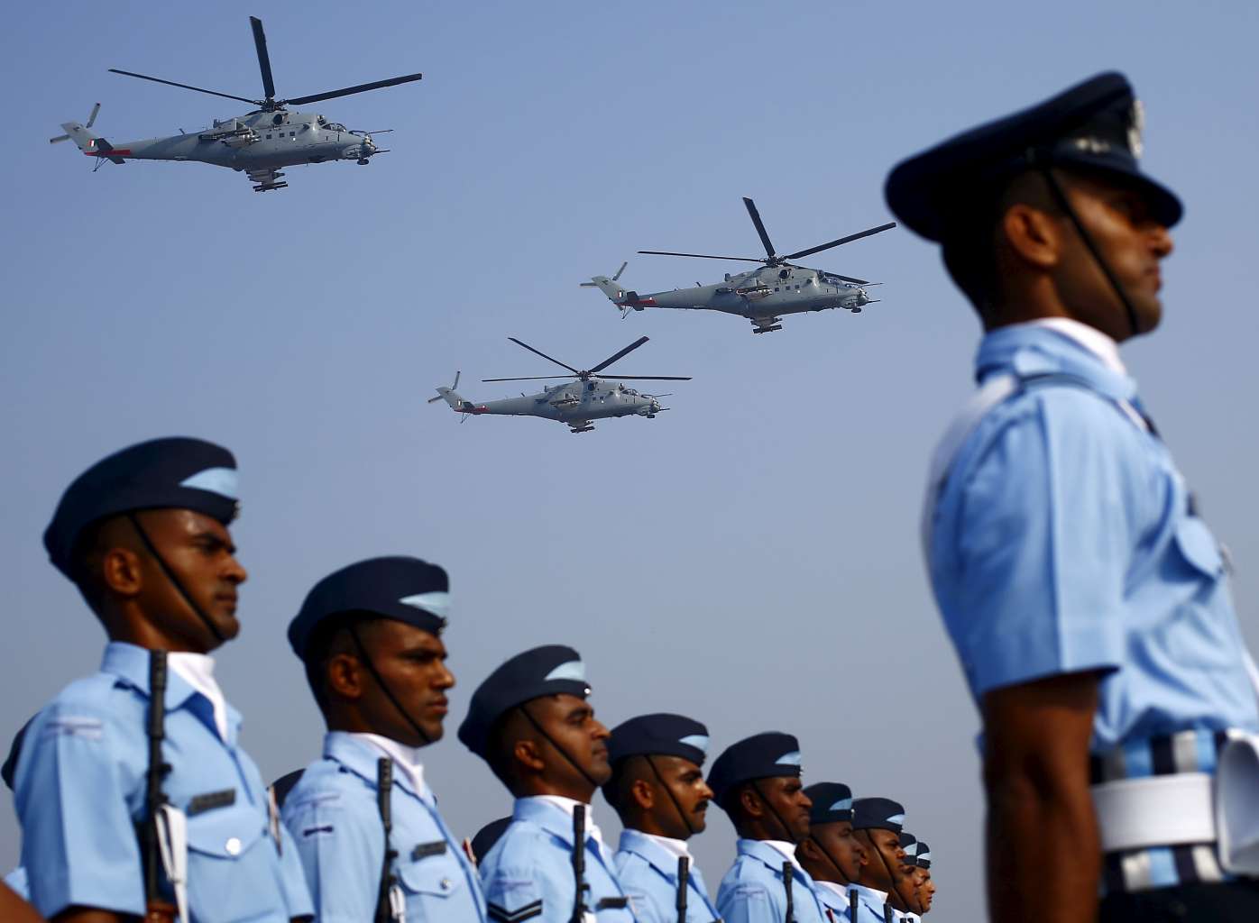 Indian Air Force soldiers march as Mil Mi-35 gunship helicopters fly during Indian Air Force Day celebrations at the Hindon air force station.