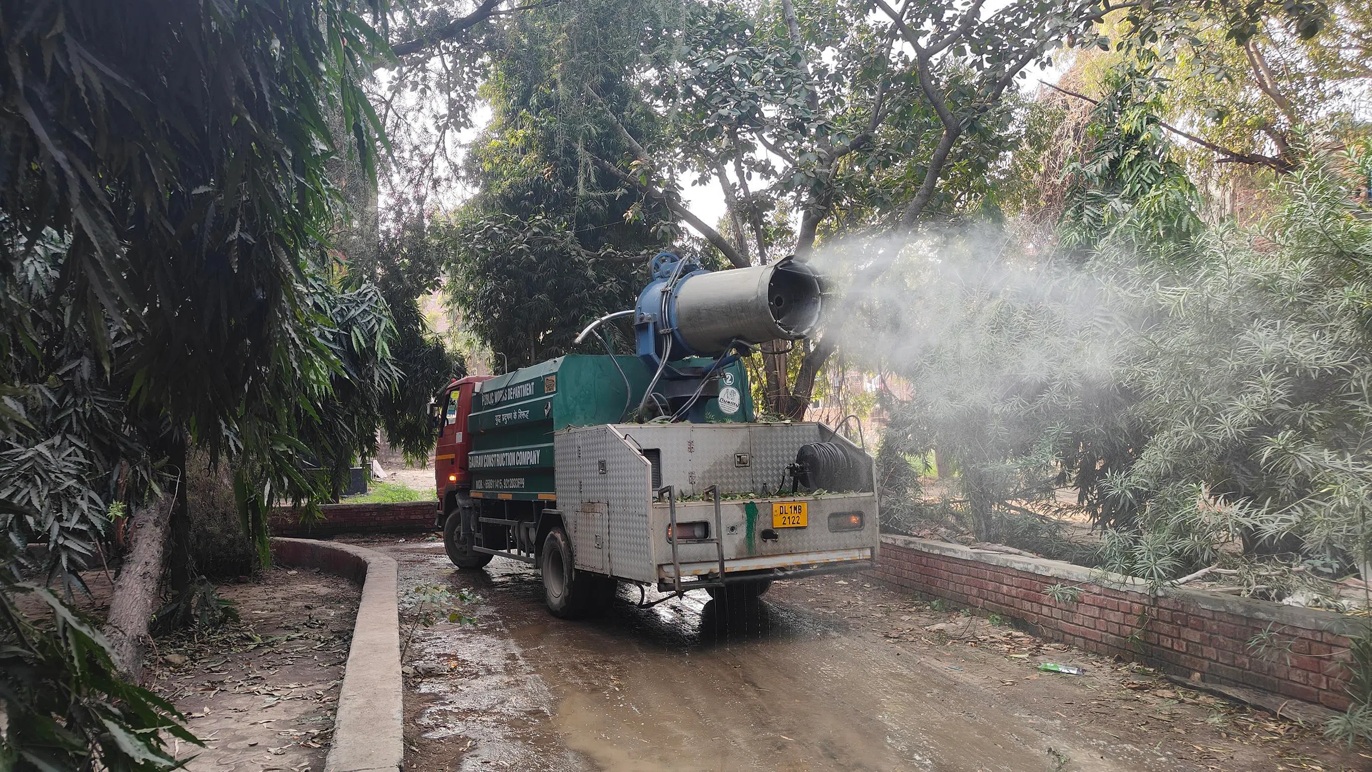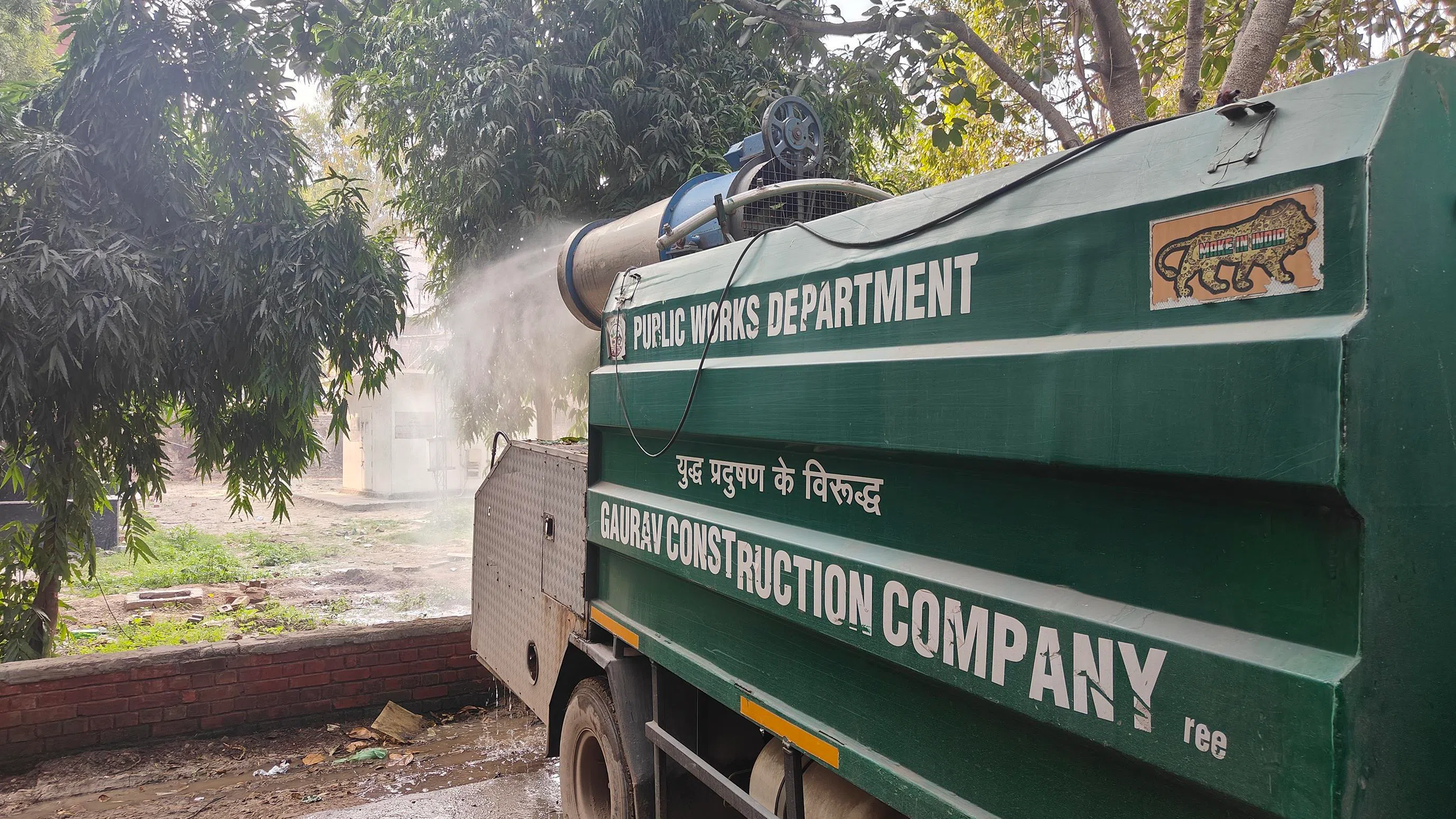 A truck spraying water in the direction of the pollution monitoring station at the Industrial Training Institute campus in Jahangirpuri.