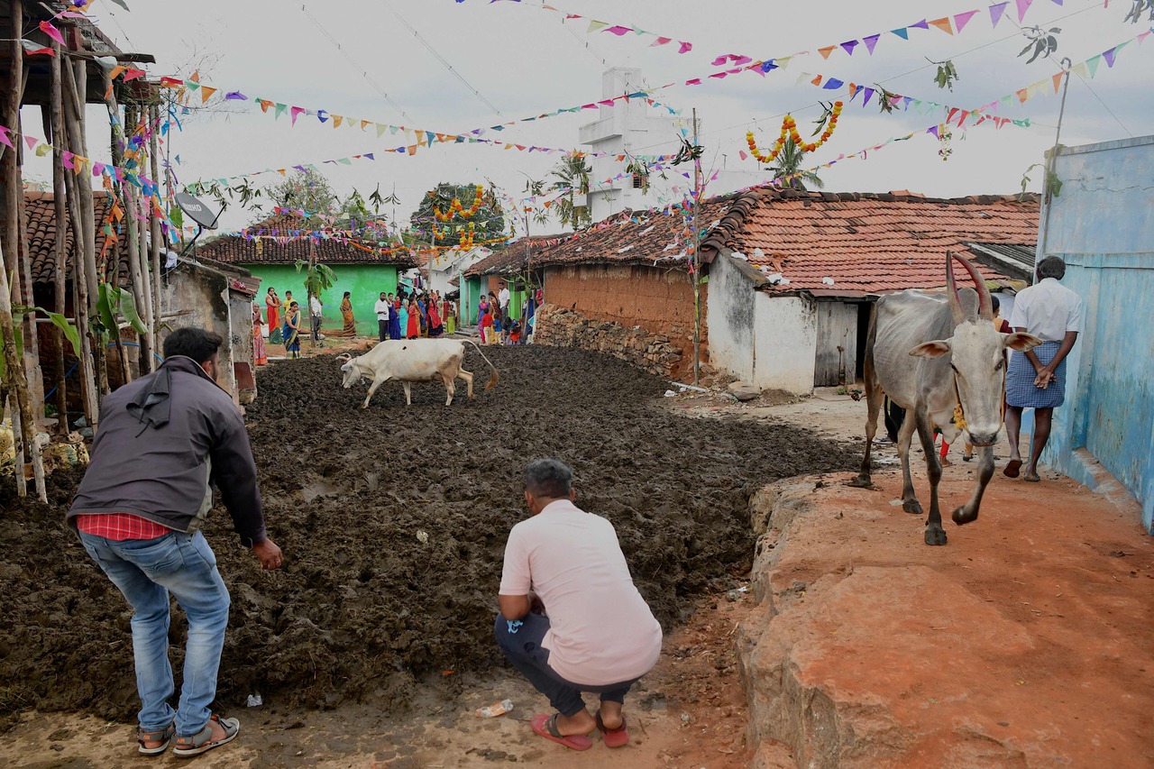 The Gorehabba festival begins with the afternoon collection of "ammunition" from cow-owning homes in the village, which lies on the border of the southern states of Karnataka and Tamil Nadu.