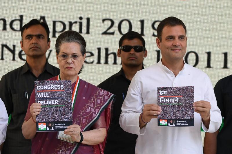 India's main opposition Congress party president Rahul Gandhi and the party's former president Sonia Gandhi launching the party election manifesto in New Delhi on April 2, 2019.