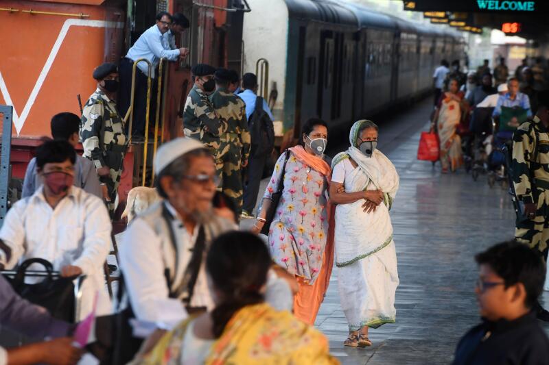 Passengers wearing face masks arrive at the platform after disembarking from the "Maitree Express" train in Kolkata, India, on March 14, 2020.