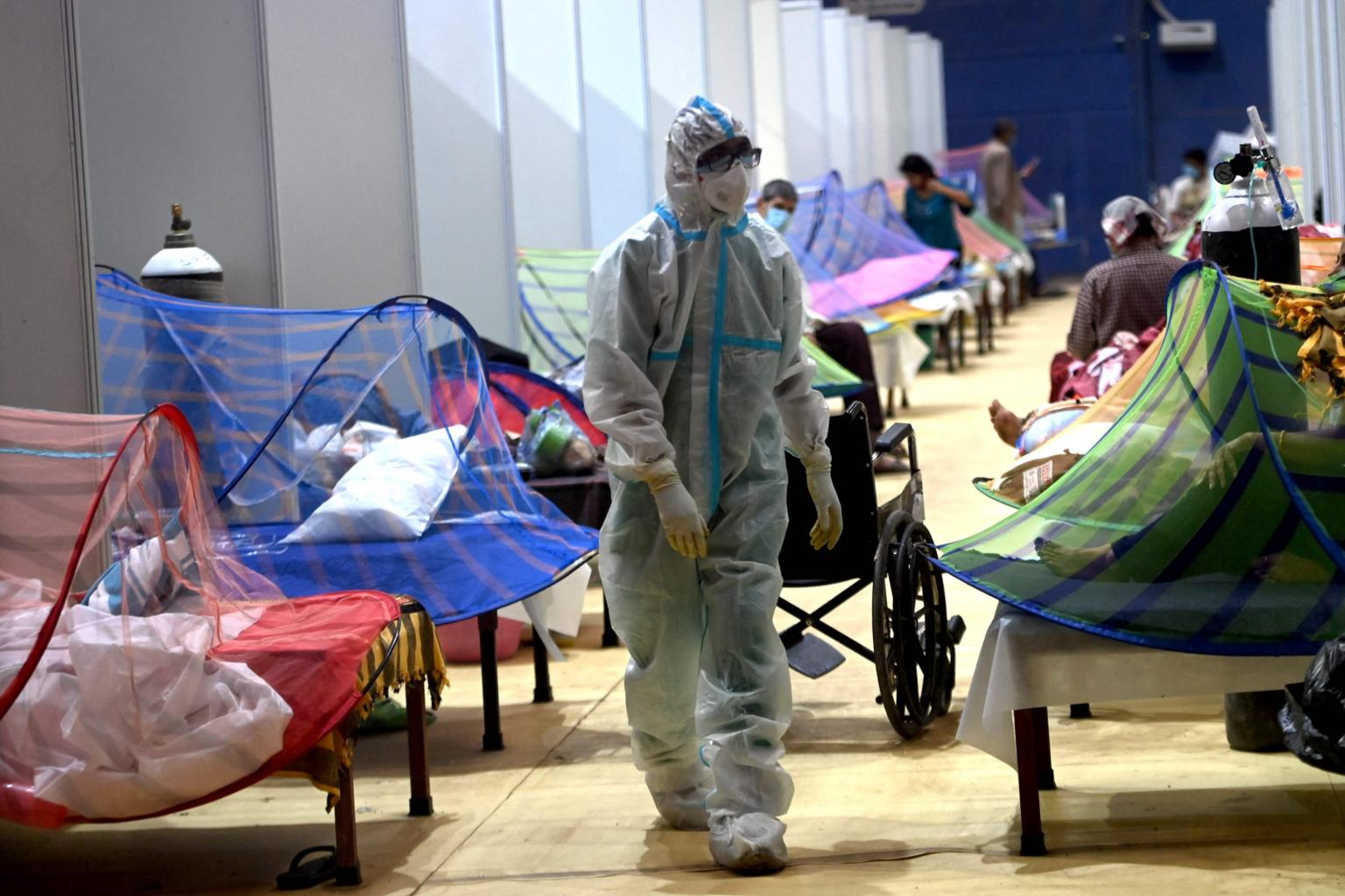 A health worker walks inside the Common Wealth Games stadium temporarily converted into a Covid-19 care centre in New Delhi, on May 5, 2021.