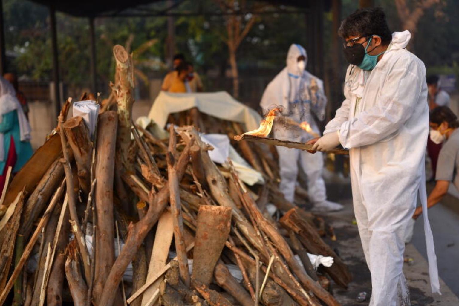 A family member performs the final rites for a Covid-19 victim at a cremation ground in New Delhi on May 10, 2021.