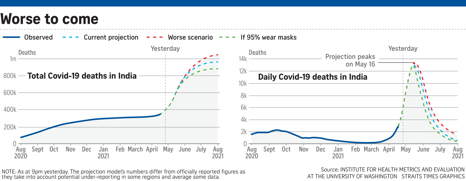 Some 200,000 more people are expected to die from Covid-19 in India over the next three weeks before the daily death toll will start to fall, according to a study by the Institute for Health Metrics and Evaluation (IHME) at the University of Washington. At the peak - around May 16 - India is likely to see more than 13,000 Covid-19 deaths a day, the projections showed. That is more than four times the 2,812 deaths the country reported yesterday, already another all-time high.