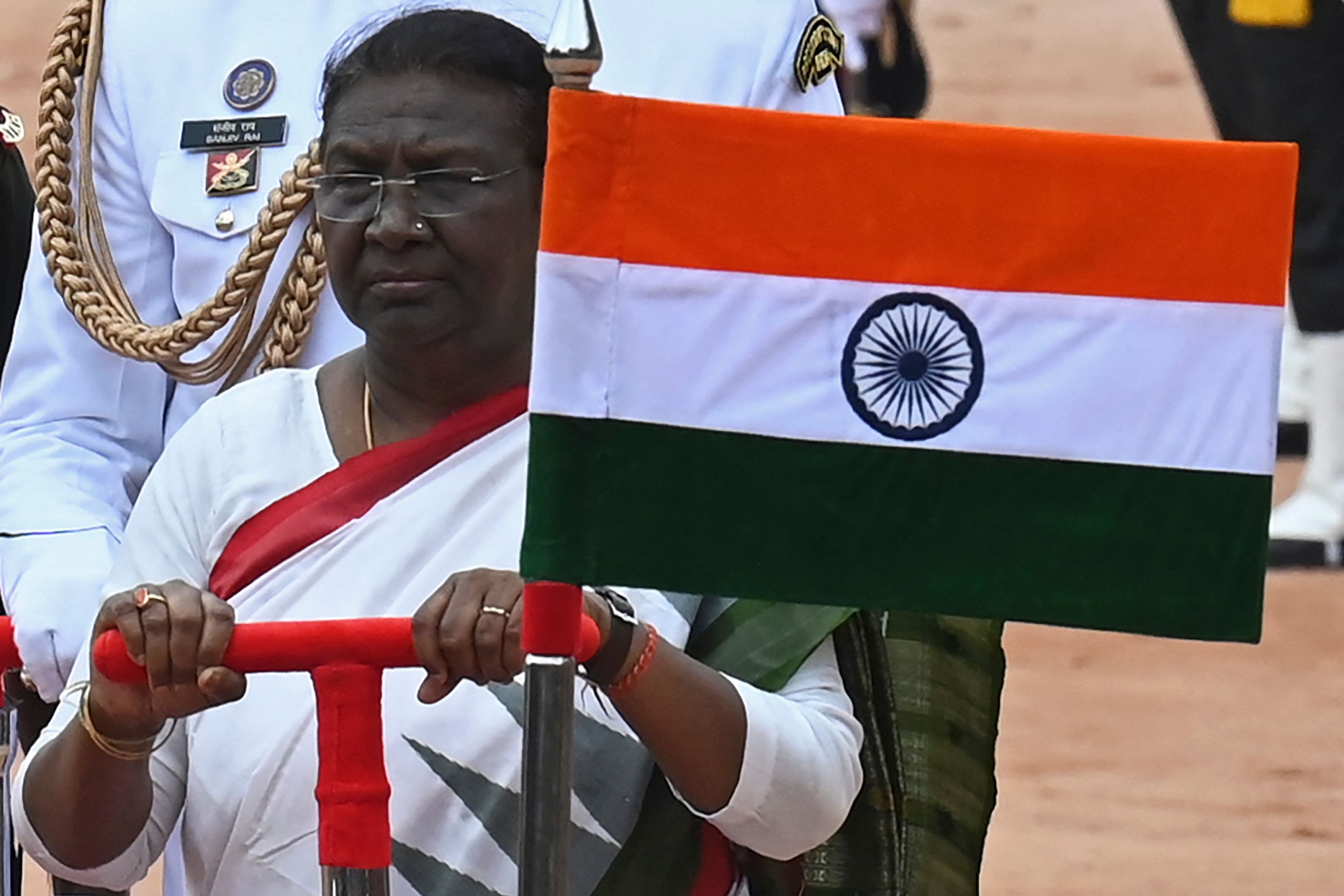 India's President Droupadi Murmu inspects a guard of honour at the presidential palace in New Delhi on July 25, 2022.