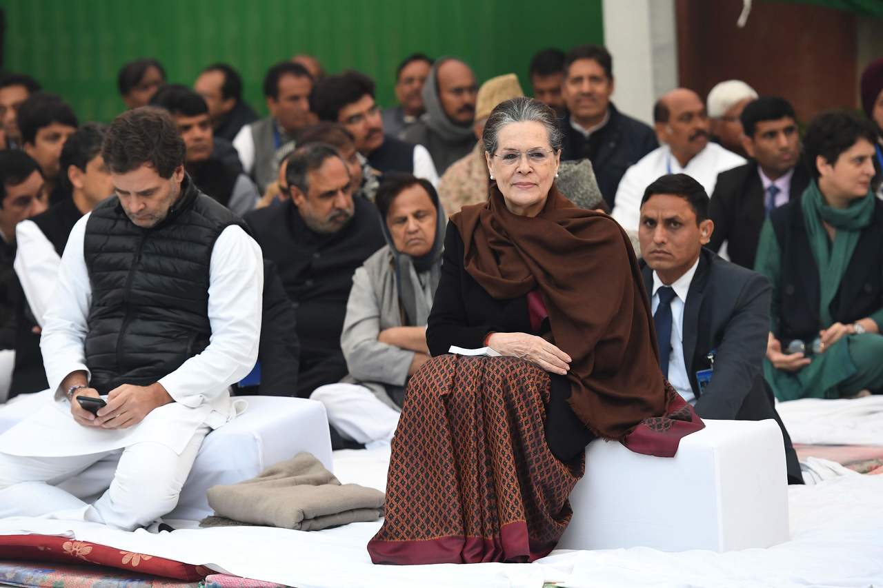Congress president Sonia Gandhi (right) and ex-party president Rahul Gandhi attend a sit-in protest for "unity" in New Delhi on Dec 23, 2019.