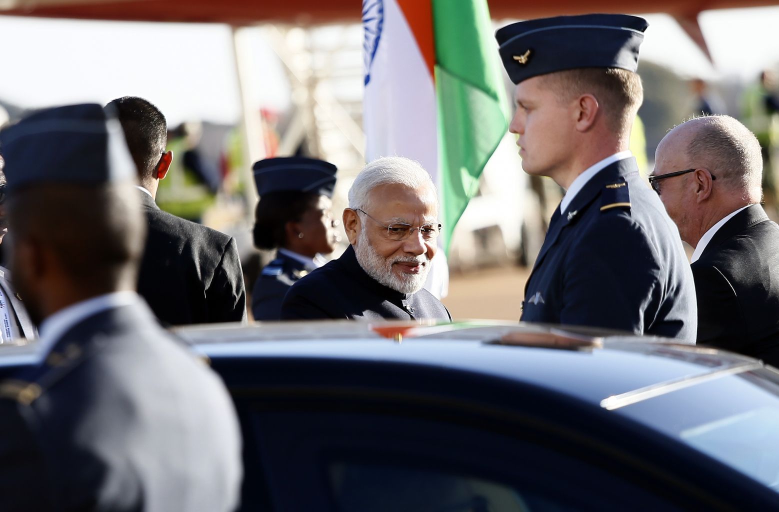 Modi (centre) arriving in Pretoria, South Africa, on July 25, 2018.
