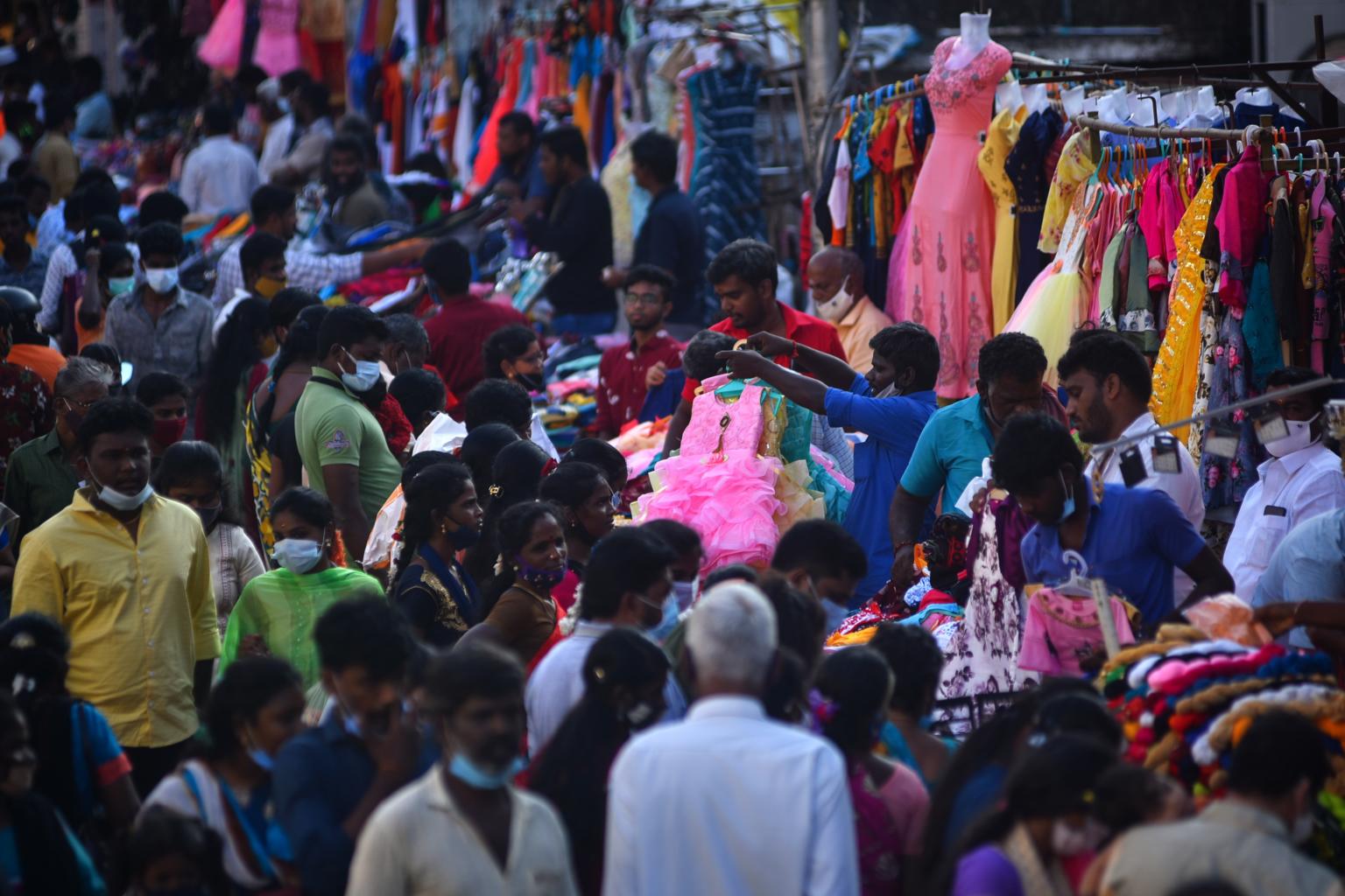 People shopping for clothes at a crowded market during the Pongal festival amid the rise in Covid-19 and Omicron cases, in Chennai on Jan 14, 2022.