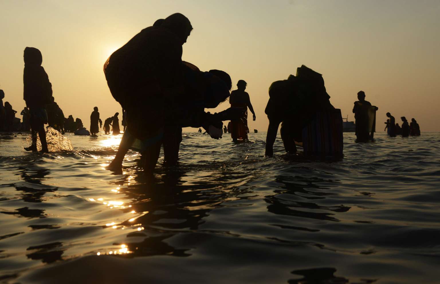 Hindu devotees performing rituals at Gangasagar Island, at the confluence of the River Ganges and the Bay of Bengal, on Jan 15, 2017.
