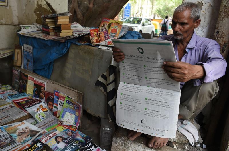 A photo illustration shows an Indian newspaper vendor reading a newspaper with a full back page advertisement from WhatsApp intended to counter fake information in New Delhi on July 10, 2018.