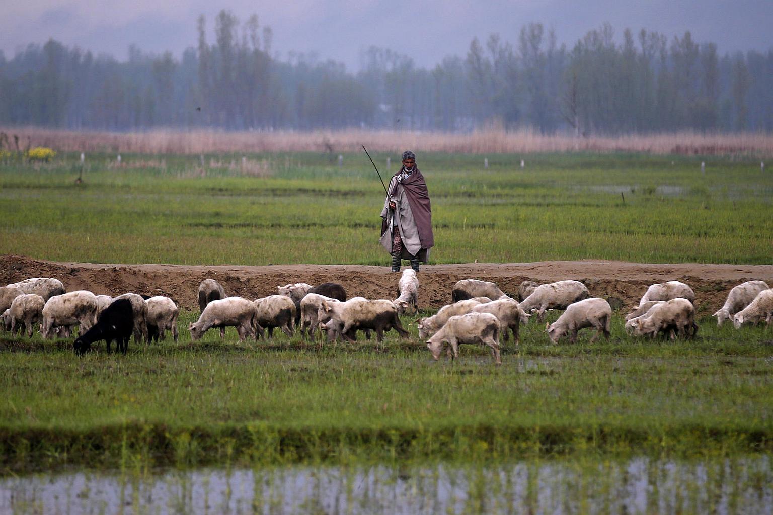 A Kashmiri farmer watches his sheep as they pasture beside a flooded paddy field in Srinagar, India on April 4.