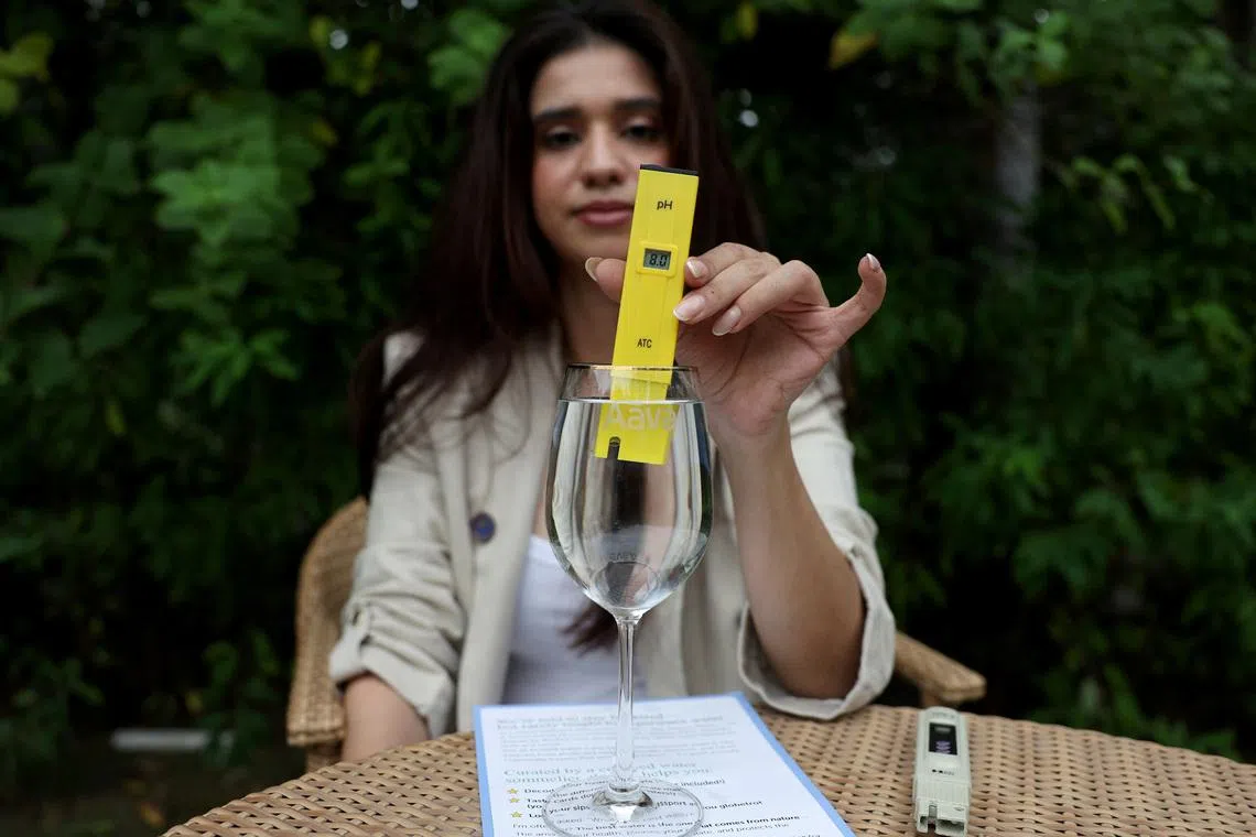 Ms Avanti Mehta testing the potential of Hydrogen (pH) of Aava Natural mineral water.