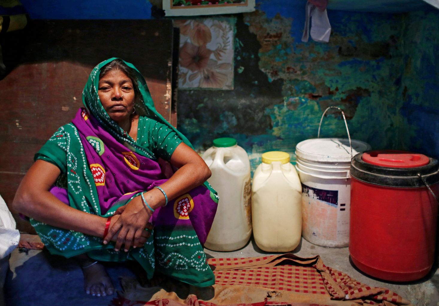 Sushila Devi, whose husband and son died after a brawl with neighbours over water in March, sits next to water containers inside her house in New Delhi, India, on June 27, 2018.