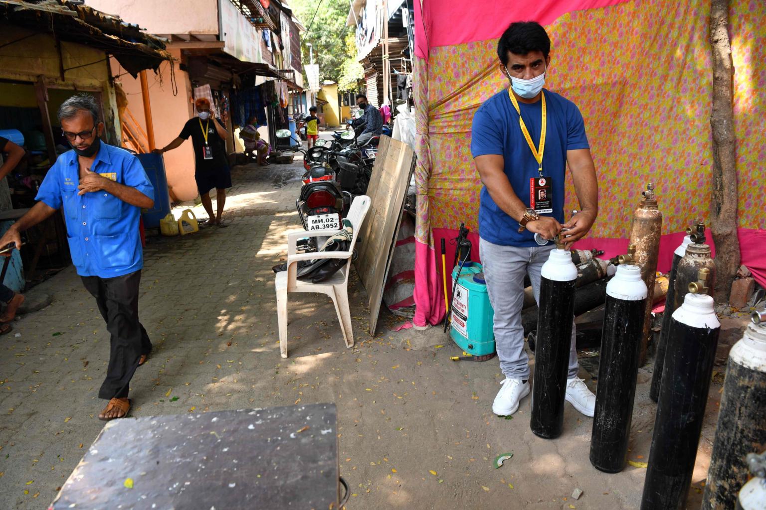 Local resident Shanawaz Shaikh (right) checks the pressure of a cylinder at an oxygen distribution centre in a slum in Mumbai, on April 28, 2021.
