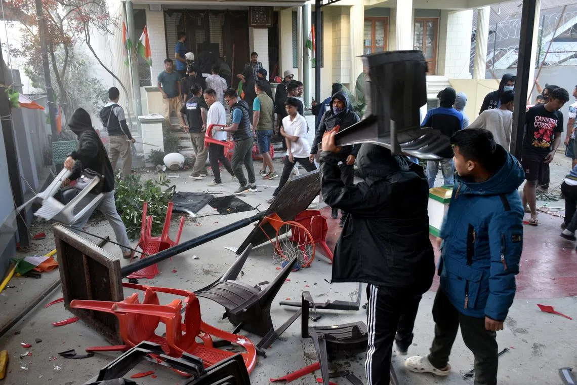 Demonstrators breaking furniture after storming the residence of a lawmaker, during a protest in Imphal West, in the northeastern state of Manipur, on Nov 16.