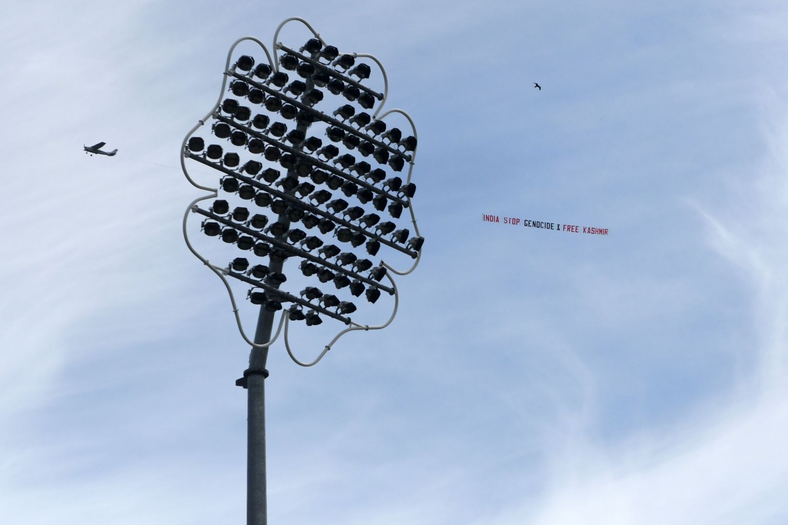 A light aircraft tows a banner with the words "India Stop Genocide & Free Kashmir" during the match.