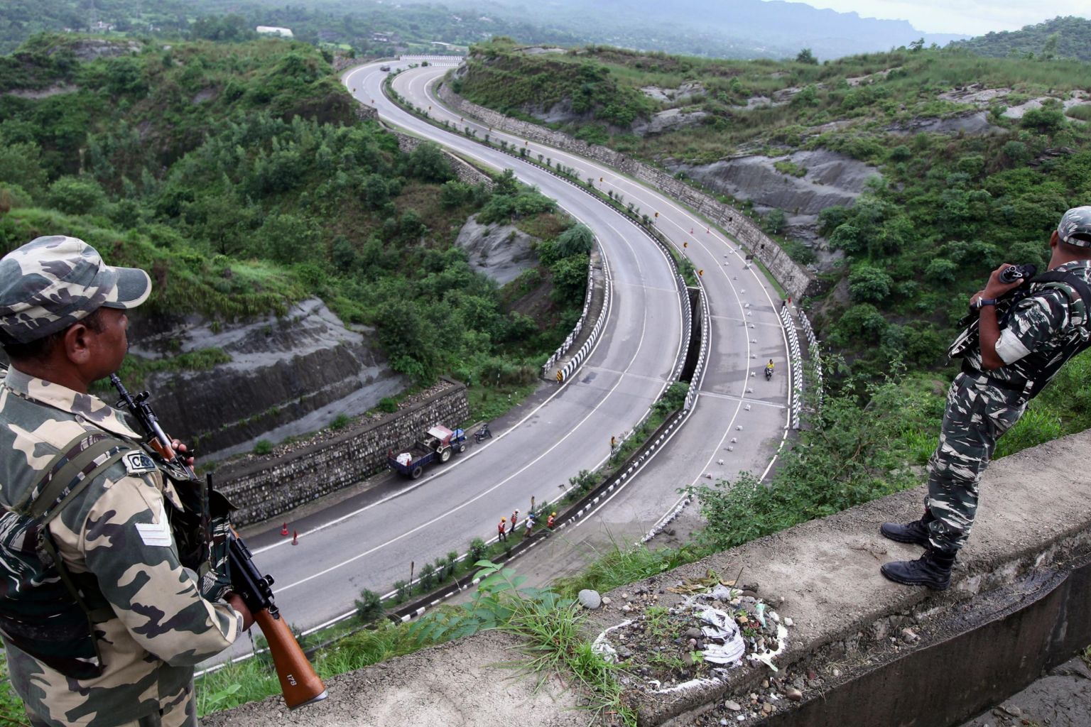 Indian security personnel stand guard overlooking the Jammu-Srinagar highway in Nagrota near Jammu on Aug 14, 2019.