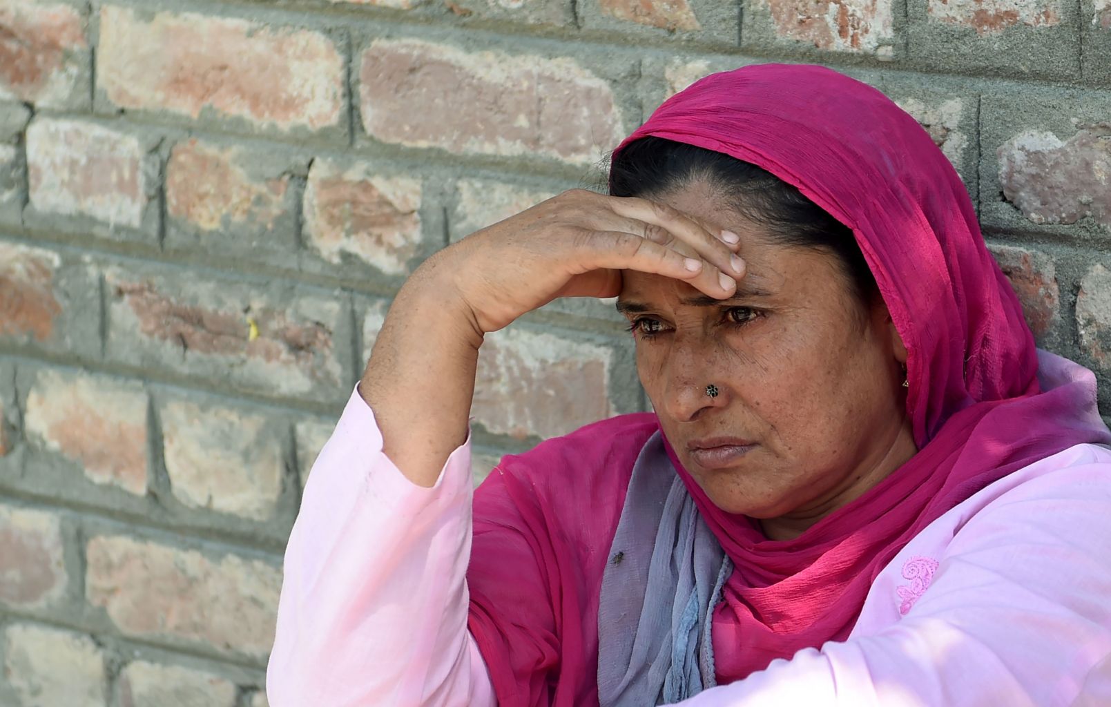An Indian Kashmiri woman waits outside a police station after her relative was detained during night raids in Srinagar.