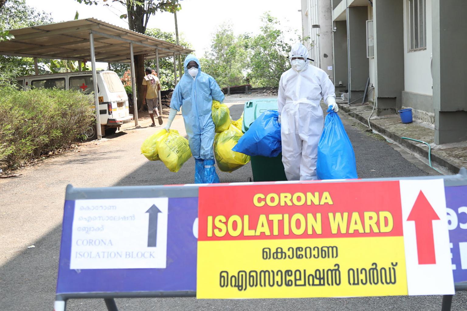 Medical staff in full protective suits carry medical waste as they exit from the coronavirus isolation ward in Kochi, Kerala, India, on Feb 3, 2020.