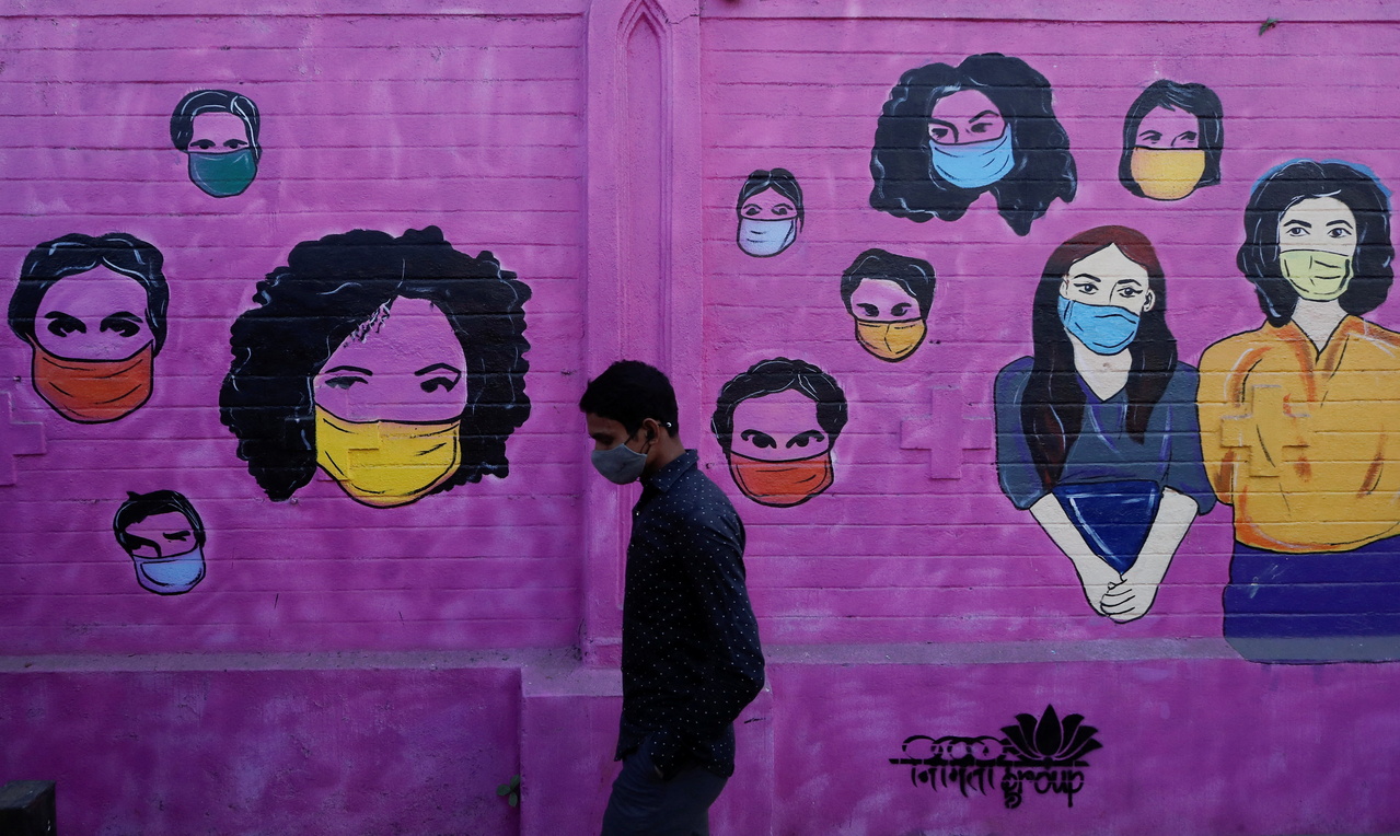 A man wearing a protective face mask walks past a mural on a street in Mumbai on Jan 10, 2022.