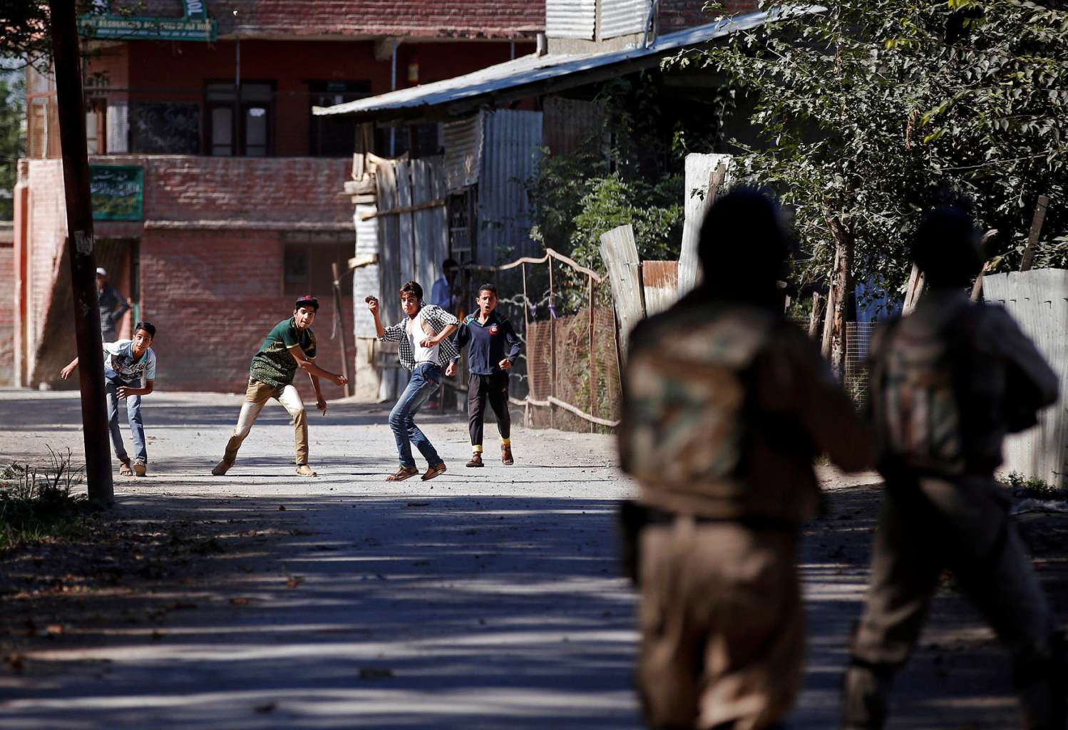 Youths hurl stones towards the Indian police during a protest against the recent killings in Kashmir, on Sept 16, 2016.