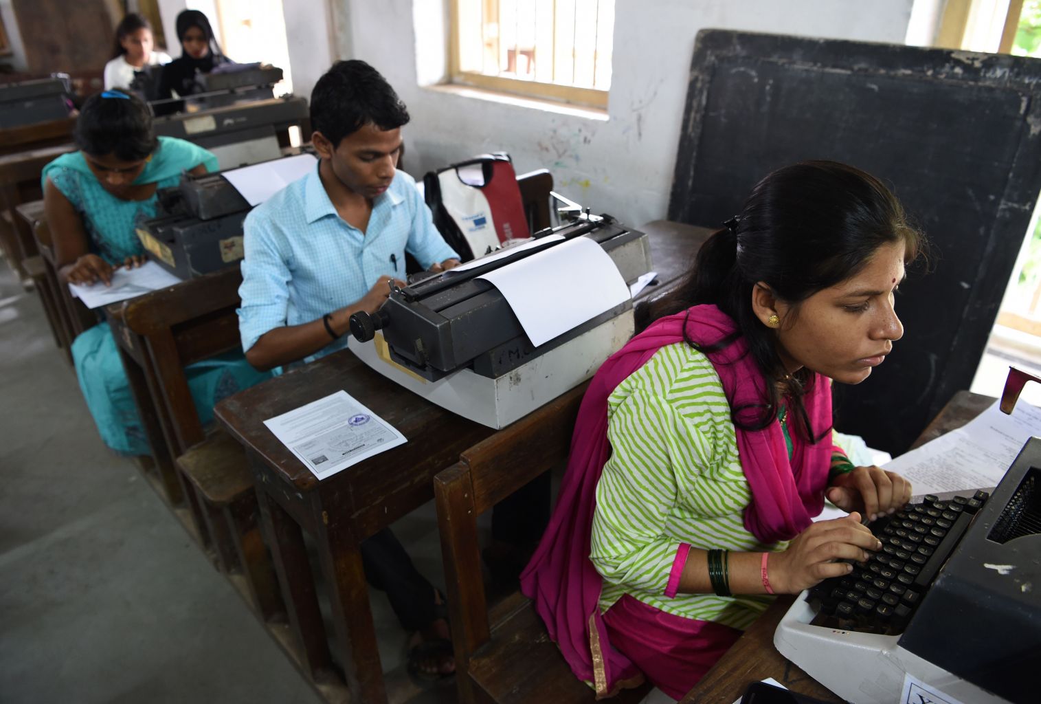 Candidates use typewriters during the last official typing exam conducted by the state government in Mumbai on Aug 7, 2017.
