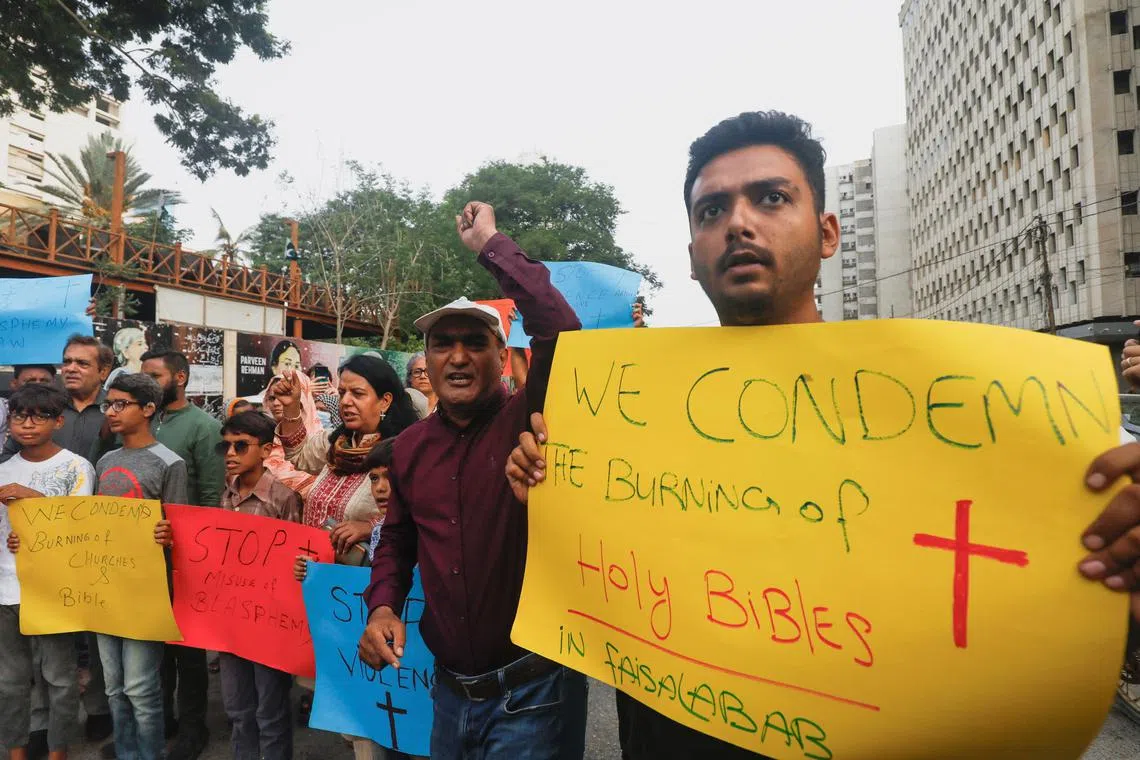 Members of the Pakistan Christian community protesting against the attacks on churches and houses in Faisalabad, during a demonstration in Karachi on Aug 16.