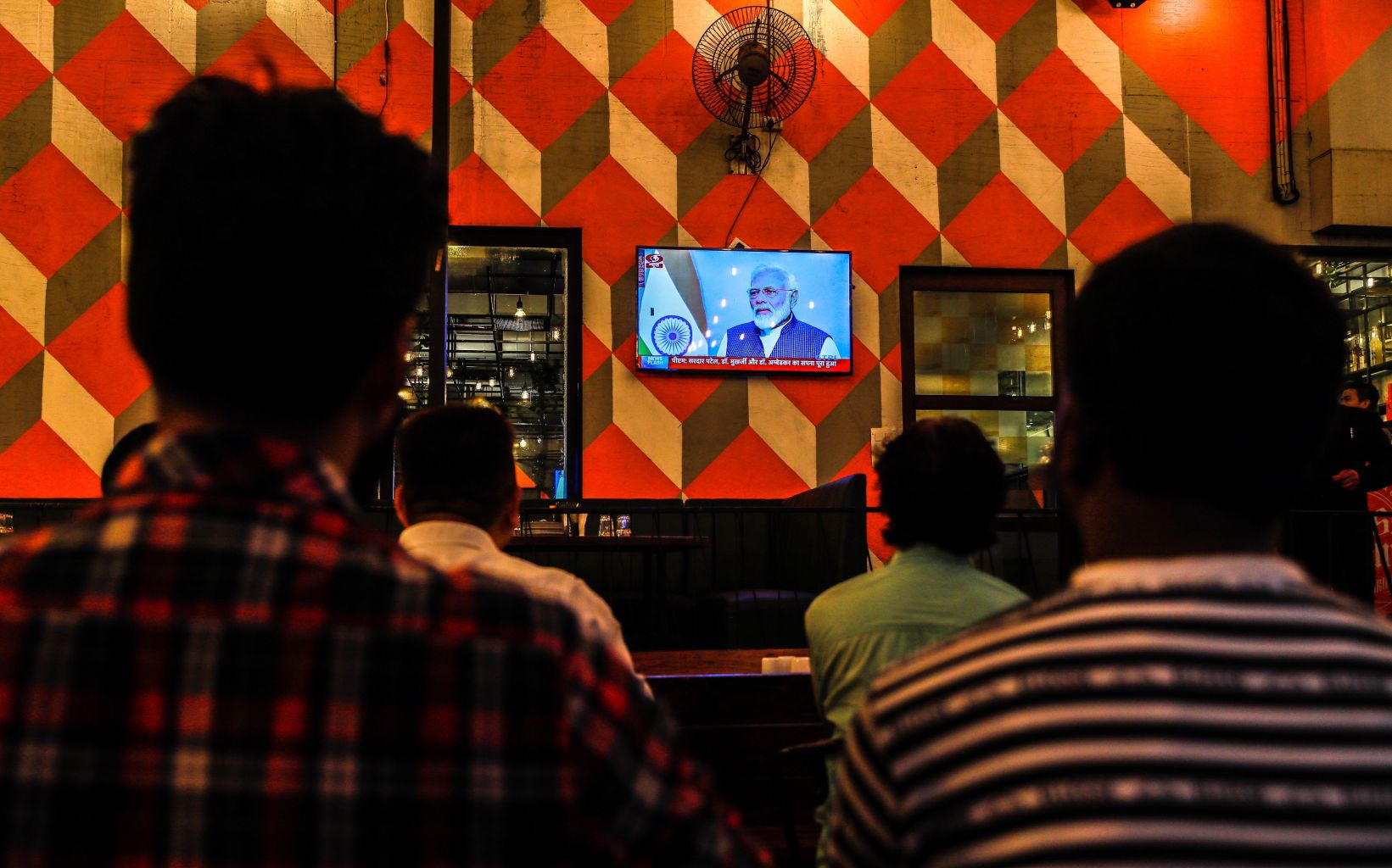 People watch a live address by Indian Prime Minister Narendra Modi.