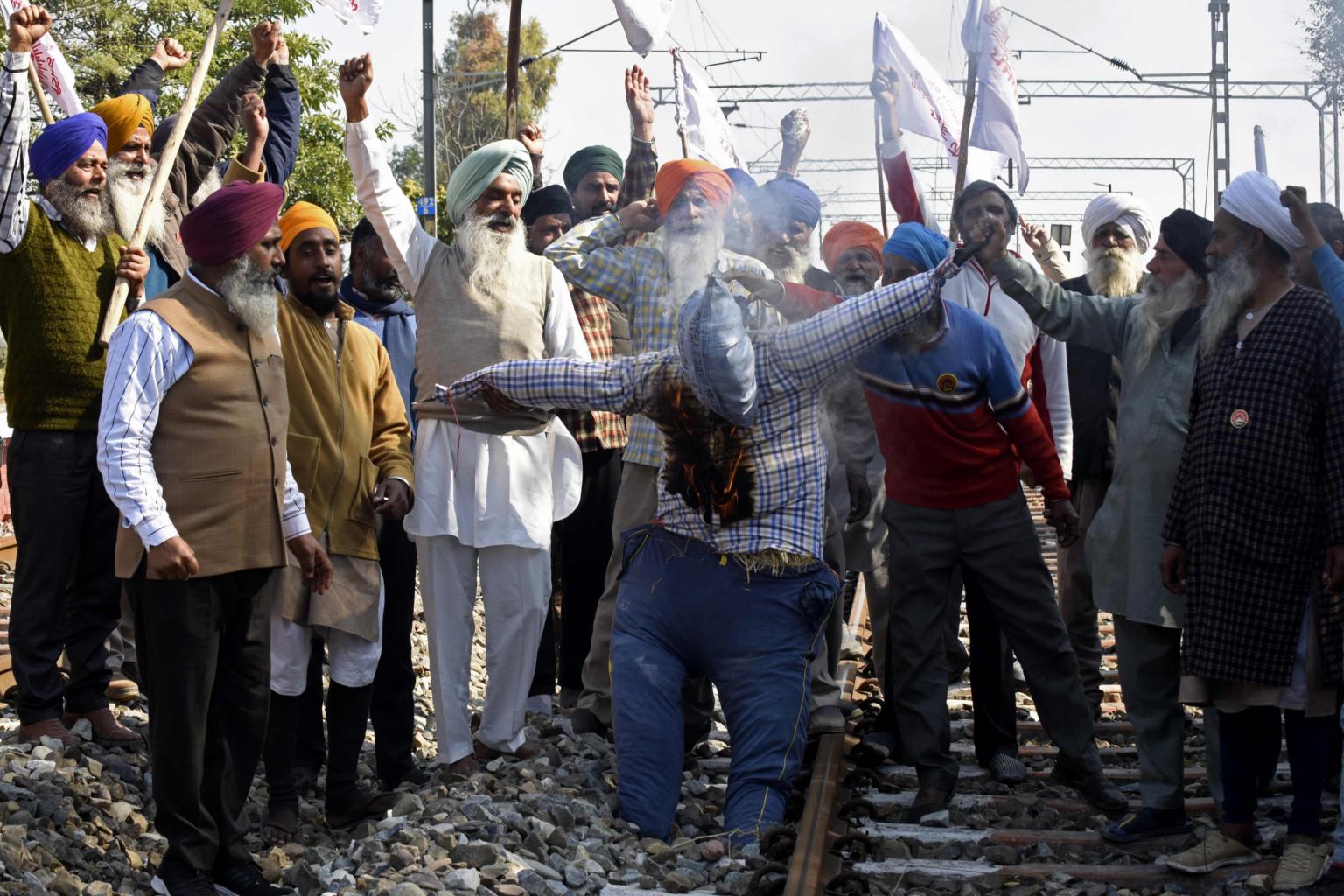 Farmers burn an effigy of Indian Prime Minister Narendra Modi during a protest on the outskirts of Amritsar on Feb 5, 2021.