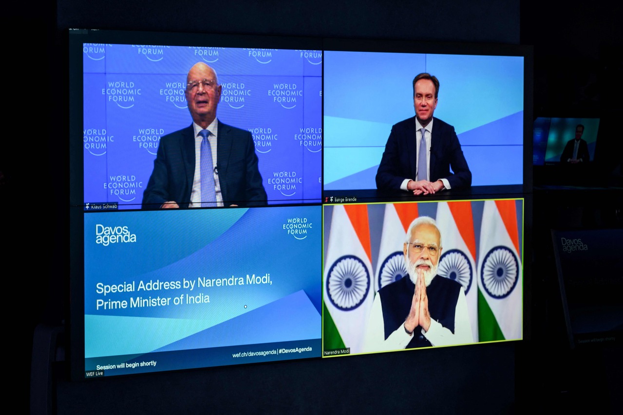 <p>(Clockwise from L) Founder and Executive chairman of the World Economic Forum (WEF) Klaus Schwab and WEF president Borge Brende listen India's Prime Minister Narendra Modi speaking remotely during the World Economic Forum (WEF) Davos Agenda virtual sessions at the WEF's headquarters in Cologny near Geneva on January 17, 2022. (Photo by Fabrice COFFRINI / AFP)</p>