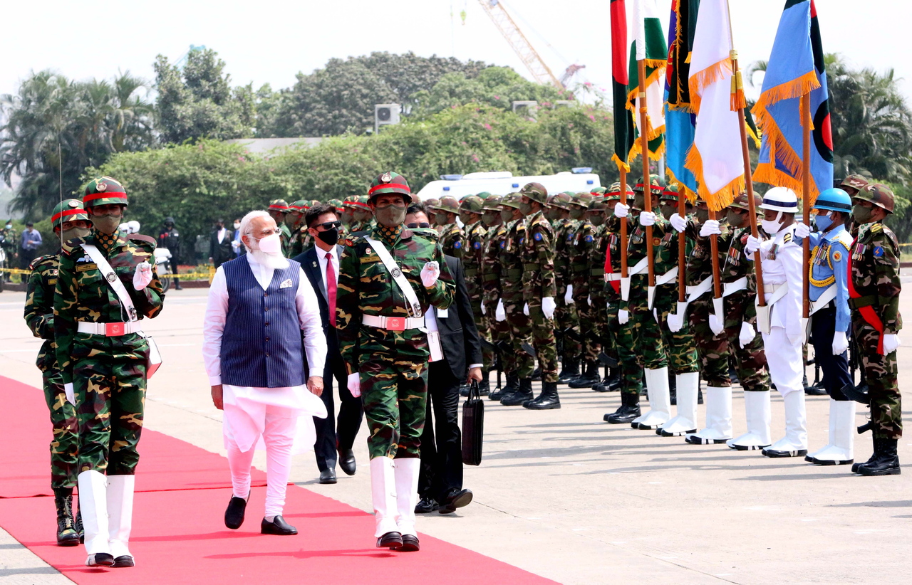 Indian Prime Minister Narandra Modi (centre) during a welcome ceremony at the Hazrat Shahjalal International Airport in Dhaka, Bangladesh, on March 26, 2021.
