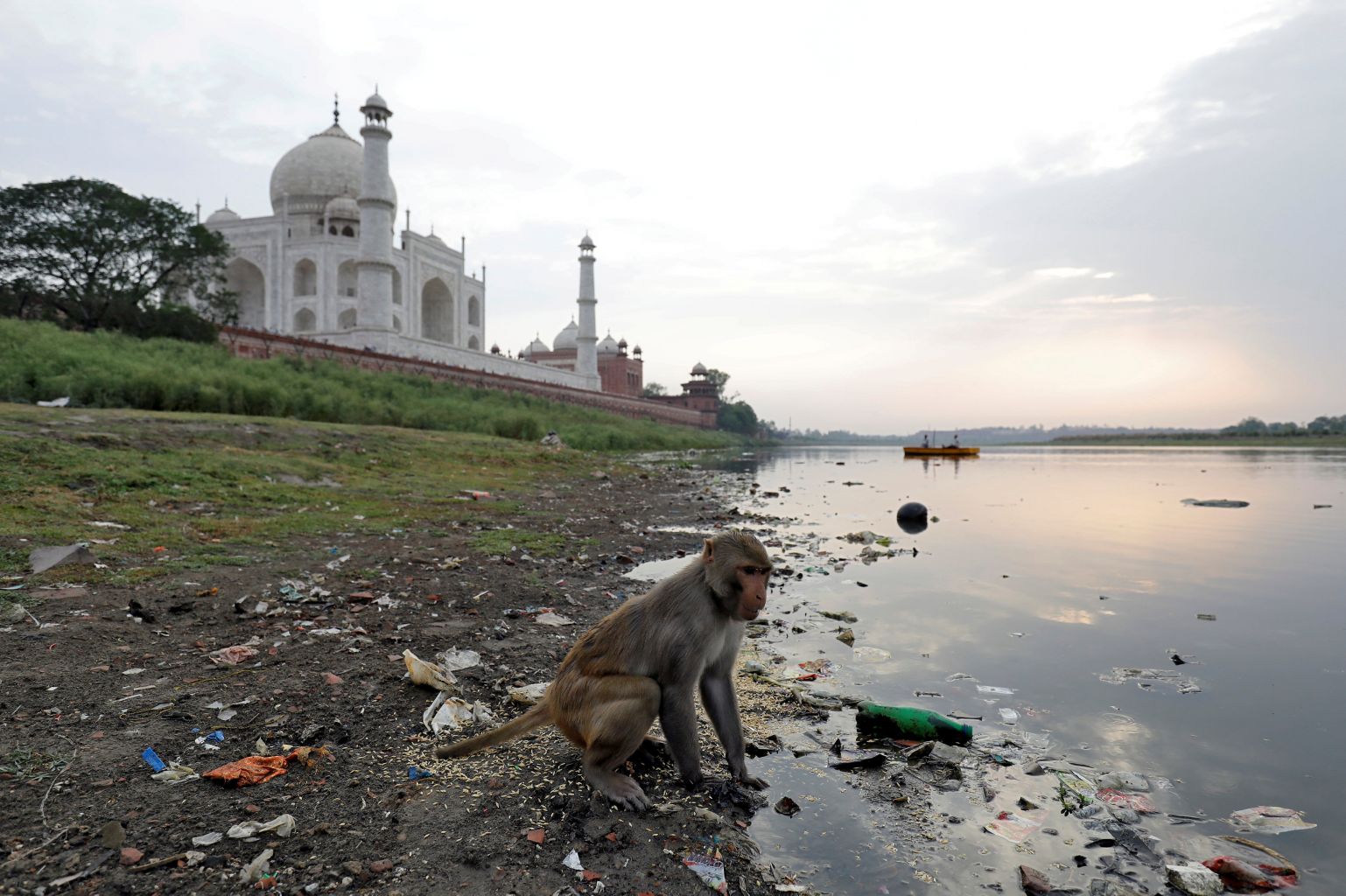 A monkey looks for food on the polluted banks of the Yamuna river, next to the historic Taj Mahal in Agra.