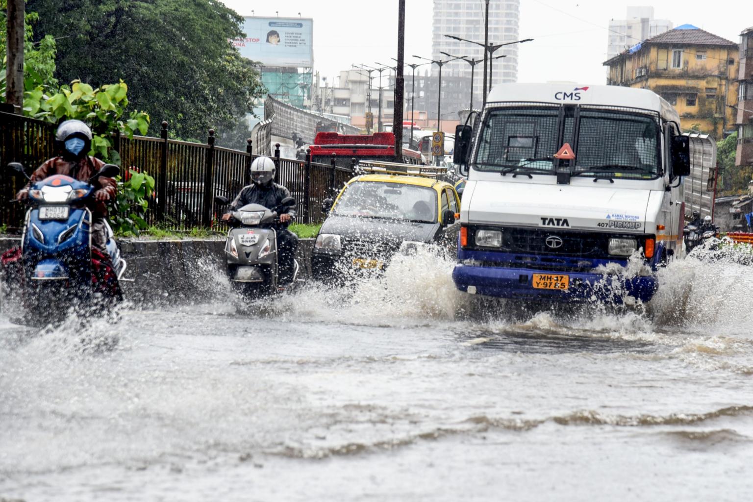 Motorists drive through a flooded road during a rain shower in Mumbai on July 15, 2020.