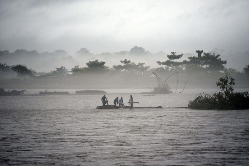 A tree being cleared in the flooded Manas river, following heavy rainfall in Baksa district of Assam, India, on July 15, 2019.