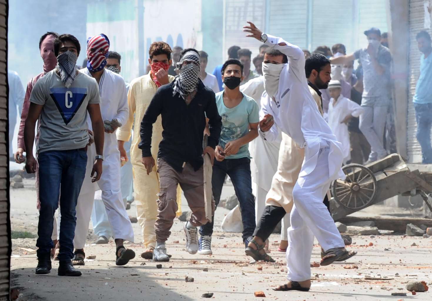 Indian Kashmiri protesters clash with Indian government forces during the Muslim festival of Eid-ul-Adha during a curfew in Srinagar on Sept 13, 2016.