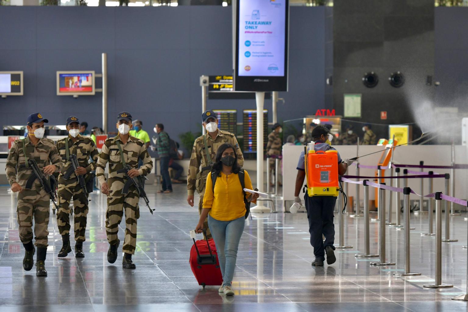 An airport worker sprays disinfectant at the domestic departure check-in terminal of Bangalore International Airport, on June 2, 2020.