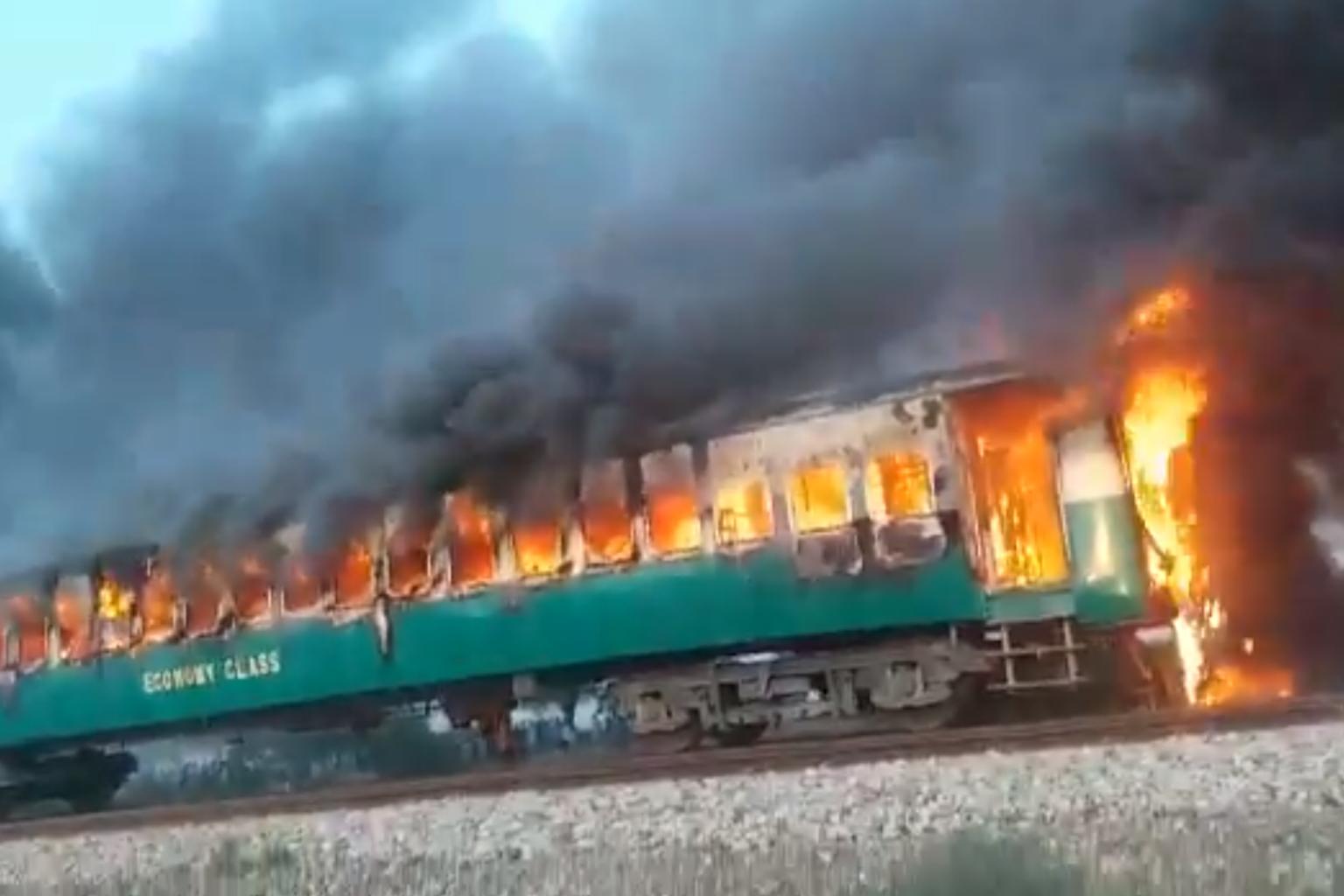 Television footage showed flames pouring out of the carriages as people could be heard crying in the incident near Rahim Yar Khan district in Punjab province.