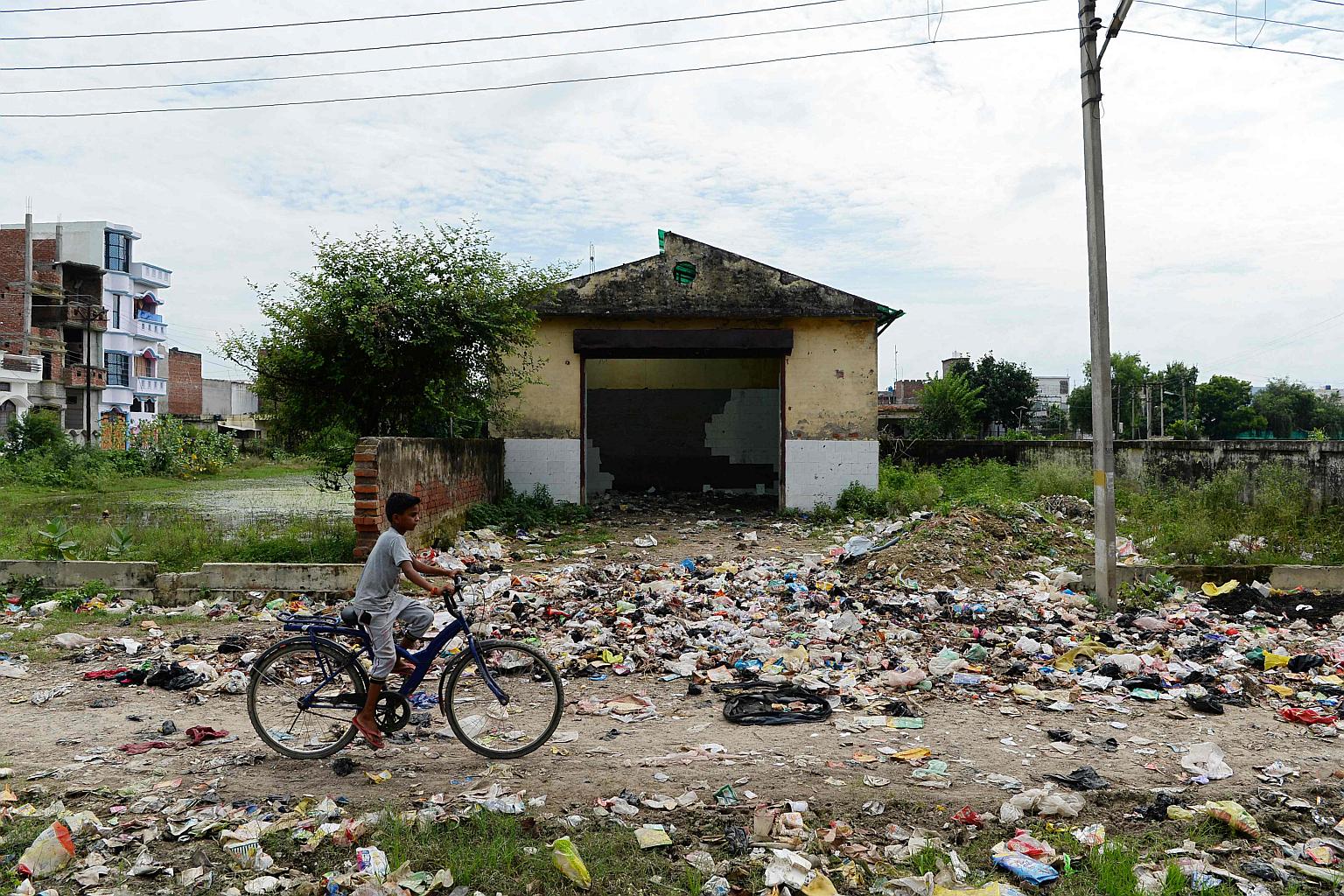 A boy rides a bicycle near a littered path in Gonda district, in the Indian state of Uttar Pradesh, on Aug 20, 2017.