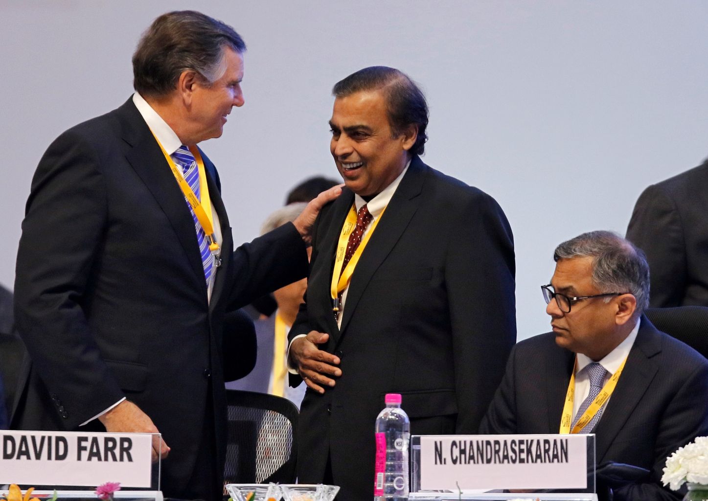 A January 2019 photo shows David Farr, CEO of Emerson Electric, speaking to Mukesh Ambani, as Tata Sons chairman Natarajan Chandrasekaran looks on at the Vibrant Gujarat Global Summit in India.