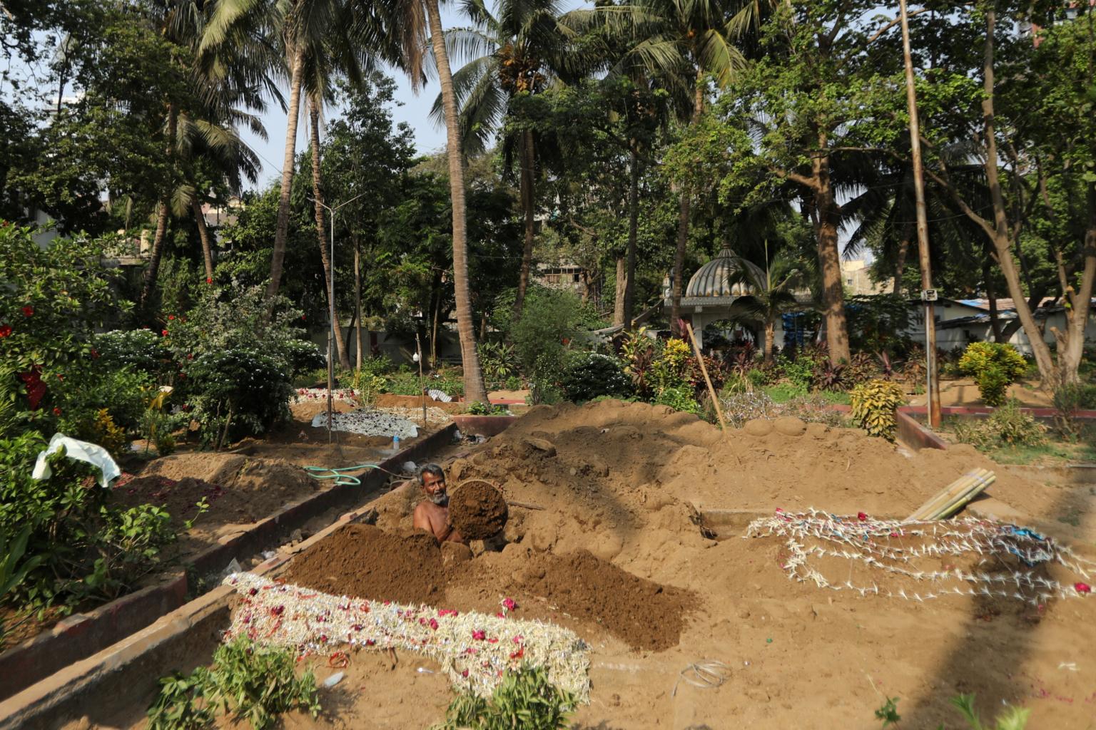 An assistant of gravedigger Sayyed Munir Kamruddin preparing a grave for a Covid-19 victim in Mumbai, on April 28, 2021.