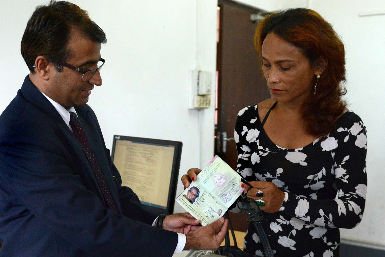 Nepalese transgender and the first recipient of a Nepalese transgender passport, Monica Shahi (right) from Kailali district receives her new passport at the offices of the passport department in Kathmandu on Aug 10, 2015.