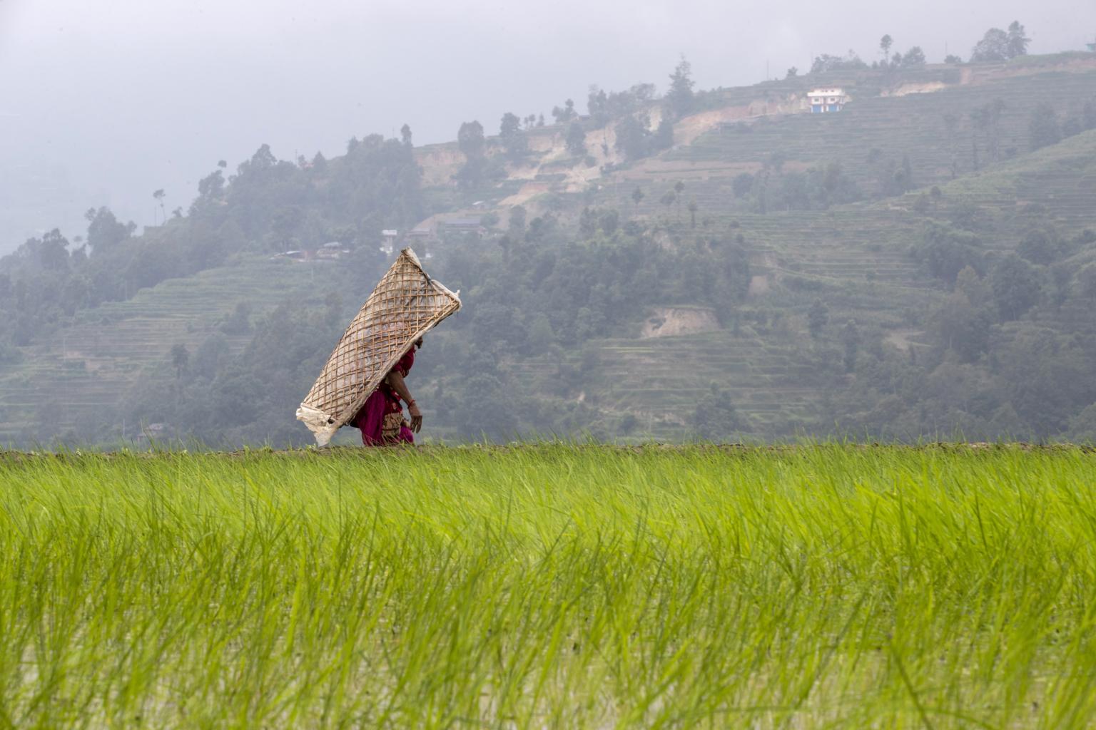 A farmer wearing traditional rain protection gear walks in a paddy field in Nuwakot village, Nepal.