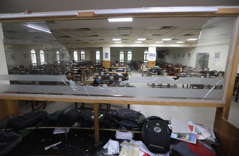On Monday morning, sections of university library lay in ruins. Windows were smashed, chairs lay broken and scattered. Crushed glass covered corridors and tables.