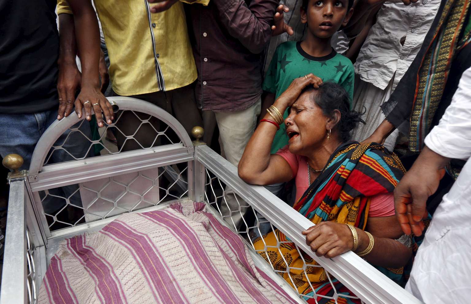 A woman mourns next to the body of Mohammad Ramzani, a cycle rickshaw driver who died in the collapse.